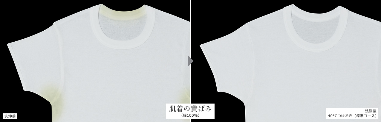 ※すべての黄ばみを除去できるわけではありません。※当社調べ。2022年モデルBD-STX120H(BD-SW120Kと同等性能の機種)、洗濯2kg時、40℃つけおき(標準コース)において。衣類の汚れは人工皮脂によるものです。衣類の量、汚れ、洗剤の種類などによって効果は異なります。