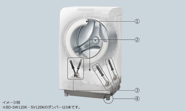 上下・左右・前後の複雑な振動を検知し、ドラム回転数を調整して振動を抑える。