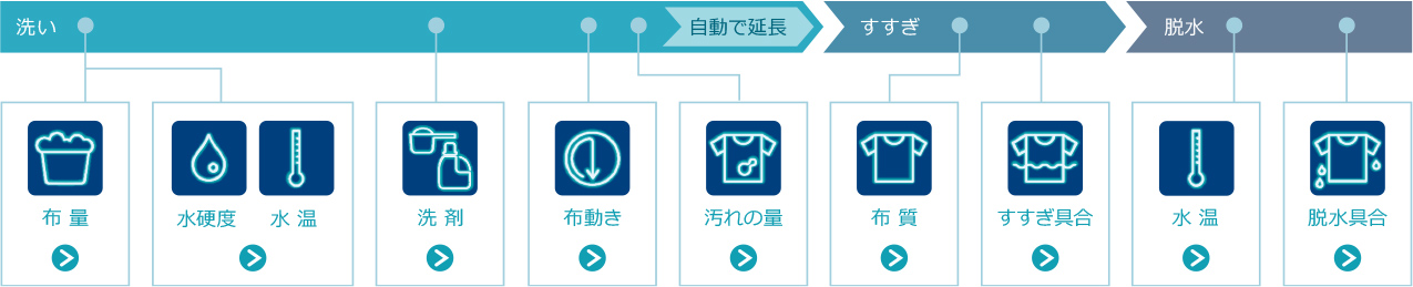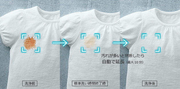 複数のセンサーで洗濯のさまざまな状況をセンシング。洗剤の種類や布質、汚れの量、水の硬度、布動きなどの状況に合わせて洗い方や運転時間などを自動で制御。これにより、かしこくきれいに洗います。