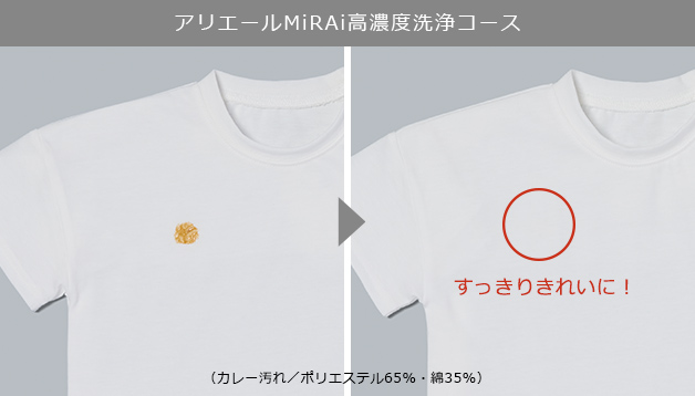 ※当社調べ。2023年モデルBD-SX130K(BD-SW120Mと同等性能の機種)、洗濯6kg時、標準コースとアリエールMiRAi高濃度洗浄コースの比較。衣類の量、汚れ、素材、一緒に洗濯するものの種類によって効果が異なります。