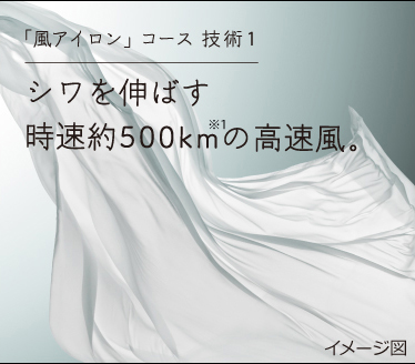 ●風アイロンコースは、衣類のシワを大幅に低減する機能ですが、衣類の量や素材、一緒に乾燥するものの種類によって仕上がりが異なります。 ●アイロンでプレスしたような効果まではありません。 ●シワが完全になくなるわけではありません。 ●生乾きや乾いた衣類の仕上げとして乾燥運転だけをした場合は、シワをとることはできません。 ●乾燥できないものには使えません(詳しくは、こちらをご覧ください)。