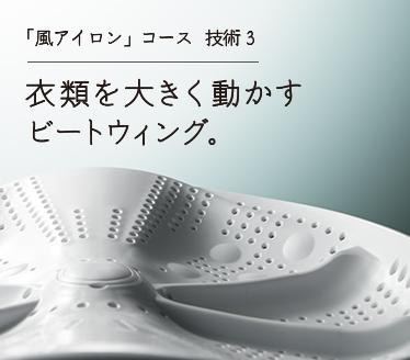 [ビートウィング]は、衣類を大きく動かし、入れ替えを促しながら回転。くぼみで吹きつけられた高速風を上向きに変え、衣類の下からも風を当てて仕上げます。