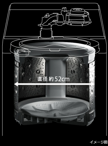 直径約52cmの大きな洗濯槽の中で、衣類を広げながら乾燥。さらに、槽が浅いため、底部の[ビートウィング(回転羽根)]まで高速風が届きます。