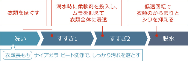 衣類をほぐしながらすすぎ、柔軟剤を効果的なタイミングで投入して、ムラを抑え全体に浸透させます。また、運転時間や回転数をコントロールし、衣類のからまりとシワを抑えながら脱水具合を調整。柔軟剤の効果をより引き出し、シワを抑えてきれいに洗い上げます。