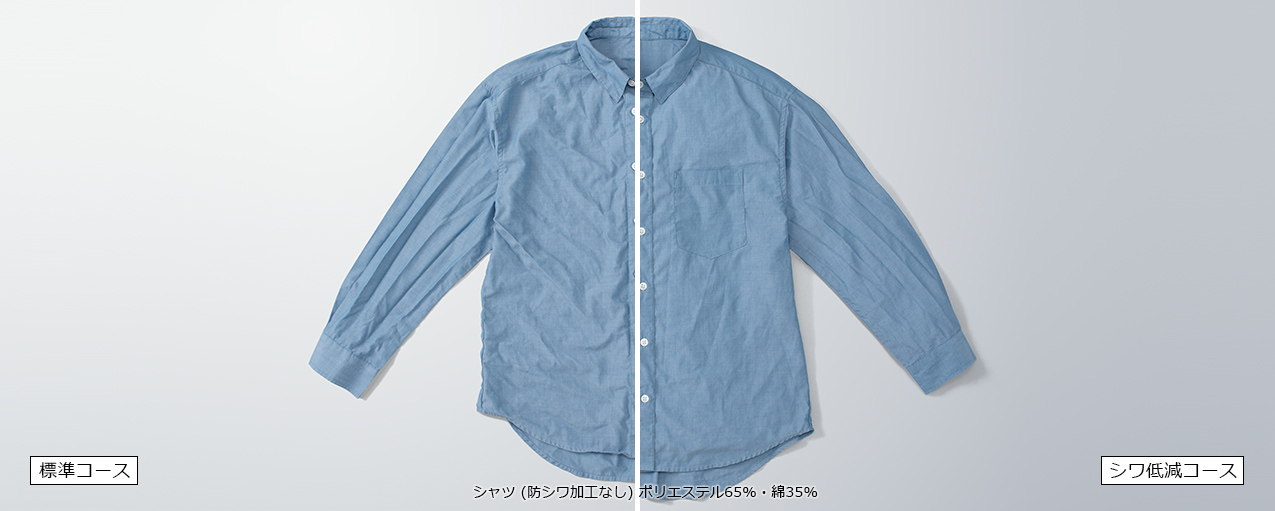 ※当社調べ。BW-DX100K、洗濯〜乾燥1kg時、標準コースとシワ低減コースとの比較。衣類の量や素材、一緒に乾燥するものの種類によって仕上がりが異なります。