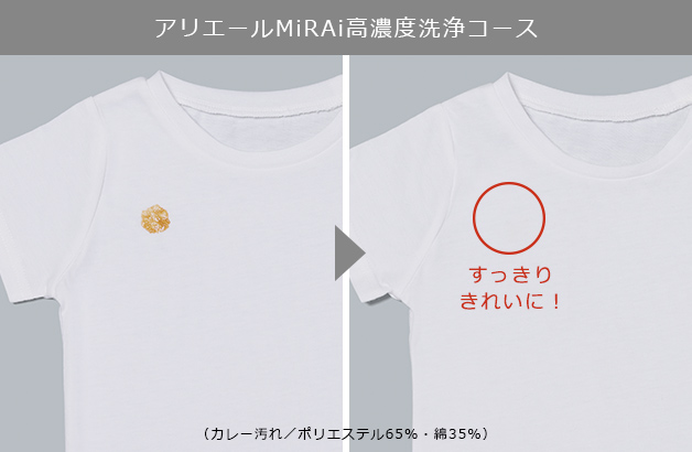 ※当社調べ。BW-X120M(BW-DX100Mと同等性能の機種)、洗濯3.6kg時、標準コースとアリエールMiRAi高濃度洗浄コースの比較。衣類の量、汚れ、素材、一緒に洗濯するものの種類によって効果が異なります。