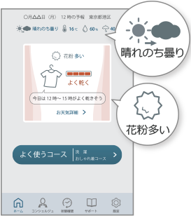 その日の洗濯指数をもとに洗濯物が乾きやすい時間帯をアドバイス、乾きにくいときは部屋干しや乾燥までの運転をおすすめ。また、天気予報や花粉情報も確認できます。