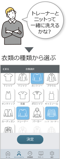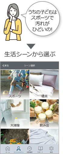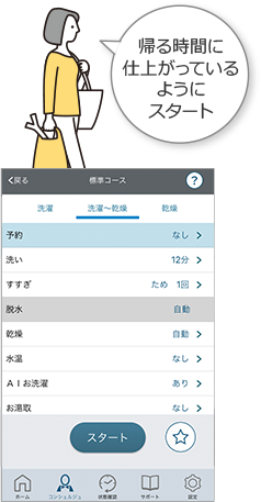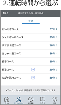 ⽣活シーンや洗濯する⾐類の種類を選ぶと、おすすめの運転コースを提案します。そのままスマホから運転をスタートできます。