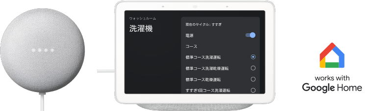 洗濯機から離れた場所で終了音が聞こえなくても、Google Nest などの Google アシスタント搭載デバイスが運転終了をお知らせします。また、スマートスピーカーに話しかけることで、運転状況や残り時間、洗濯コースなどをその場で確認できます。