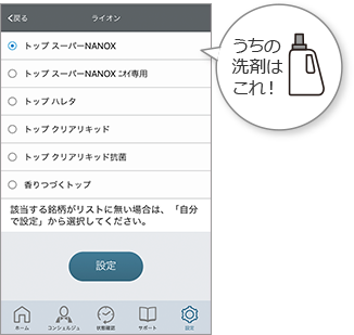 洗剤や柔軟剤の銘柄を指定すれば、投入量やすすぎ回数も自動で設定できます。