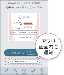 自動投入タンク内の残量と家にある在庫量から計測、洗剤や柔軟剤の在庫量が少なくなるたびに、洗剤や柔軟剤を購入できるwebサイトをアプリのホーム画面に通知します。