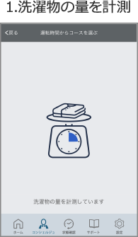 洗濯スタート前に、中に入れた衣類の量を計測し、各コースの運転時間を一覧で表示。