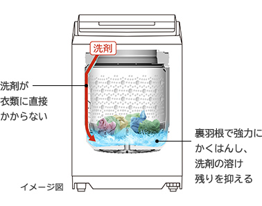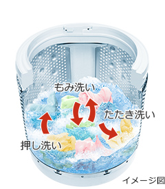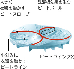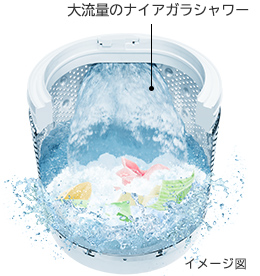 高濃度洗剤液を衣類に浸透させ、さらに、「押し洗い」「たたき洗い」「もみ洗い」効果のある[ビートウィングX(回転羽根)]と大流量の[ナイアガラシャワー]で、高い洗浄力を実現。洗いムラを抑え、きわだつ白さに洗い上げます。