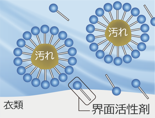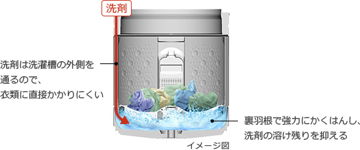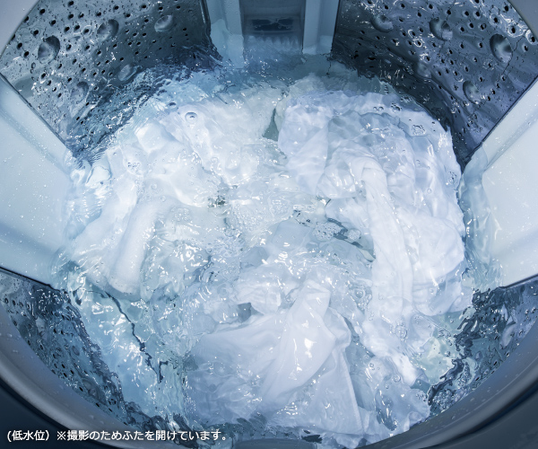 少ない水で洗剤をしっかり溶かして、高濃度の洗剤液をつくり、衣類にすばやく浸透させて汚れを浮かび上がらせます。