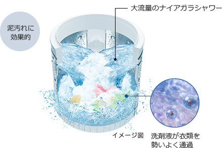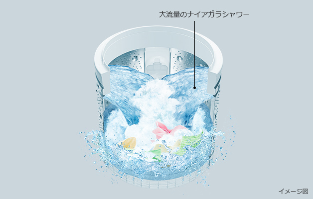 たっぷりの水を循環させる[ナイアガラシャワー]や、強い遠心力を生み出す高速回転などの技術で、汚れや繊維に潜んだ洗剤まで徹底的にすすぎます。