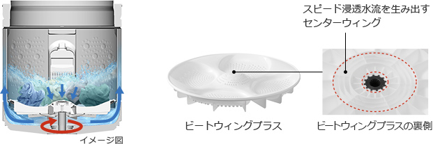 センターウィングで中央からも循環水を引き込み、衣類全体に高濃度の洗剤液の浸透を促進