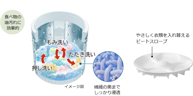 少ない水で洗剤をしっかり溶かして、高濃度の洗剤液をつくり、衣類にすばやく浸透させて汚れを浮かび上がらせます。