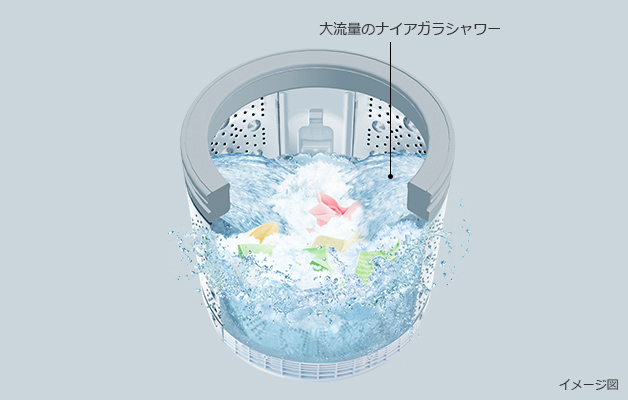 たっぷりの水を循環させる[ナイアガラシャワー]や、強い遠心力を生み出す高速回転などの技術で、汚れや繊維に潜んだ洗剤まで徹底的にすすぎます。