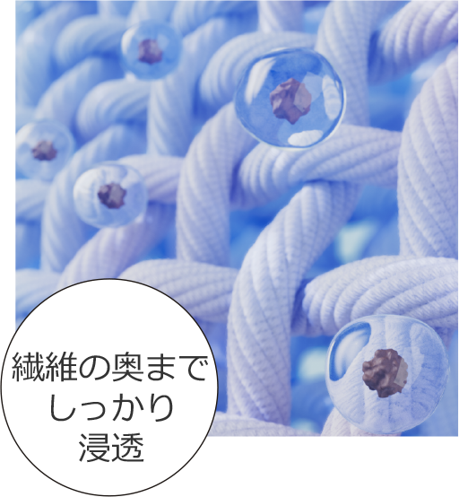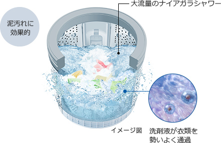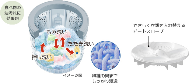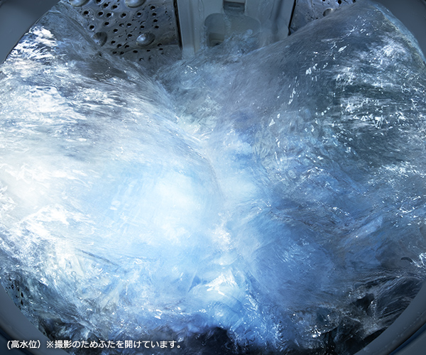 少ない水で洗剤をしっかり溶かして、高濃度の洗剤液をつくり、衣類にすばやく浸透させて汚れを浮かび上がらせます。