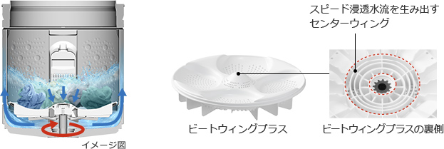 センターウィングで中央からも循環水を引き込み、衣類全体に高濃度の洗剤液の浸透を促進