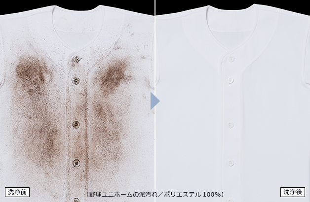※当社調べ。2024年モデルBW-DX100K(BW-V70Mと同等性能の機種)、洗濯6.0kg(6割負荷)時、標準コースにおいて。衣類の量、汚れ、洗剤、コースの種類などによって効果は異なります。※泥汚れは人工的に付着させたものです。