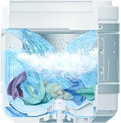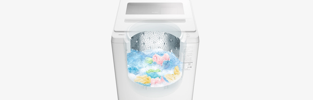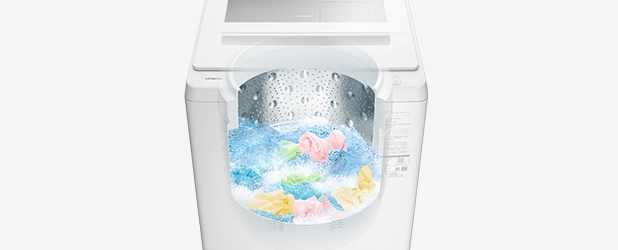 洗い始めに、少ない水で洗剤をしっかり溶かして、高濃度の洗剤液をつくり、衣類にすばやく浸透させて汚れを浮かび上がらせます。