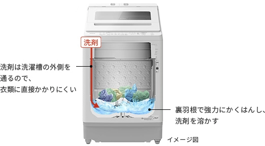 洗濯槽の下部で、濃度が均一になるように高濃度の洗剤液をつくってから洗い始めるので、洗いムラを抑えることができます。