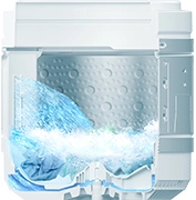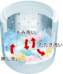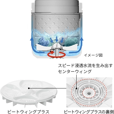 センターウィングで生み出した[スピード浸透水流]で、中央からも循環水を引き込み、衣類全体に高濃度の洗剤液の浸透を促進します。