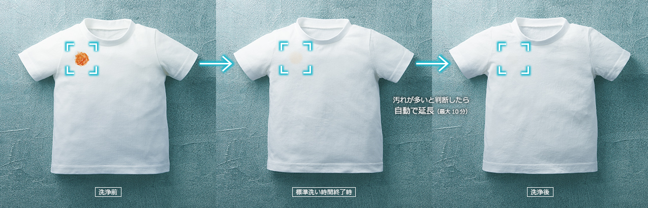 複数のセンサーで洗濯のさまざまな状況をセンシング。洗剤の種類や布質、汚れの量、水の硬度などの状況に合わせて洗い方や運転時間などを自動で制御。これにより、かしこくきれいに洗います。