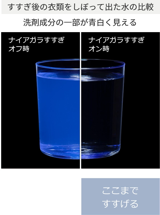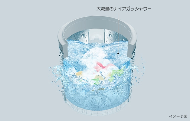 たっぷりの水を循環させる[ナイアガラシャワー]や、強い遠心力を生み出す高速回転などの技術で、汚れや繊維に潜んだ洗剤まで徹底的にすすぎます。