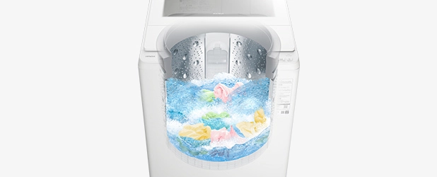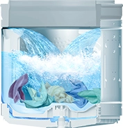 洗い始めに、少ない水で洗剤をしっかり溶かして、高濃度の洗剤液をつくり、衣類にすばやく浸透させて汚れを浮かび上がらせます。