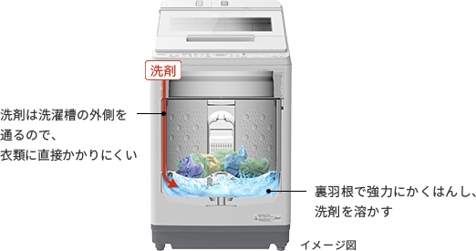 洗濯槽の下部で、濃度が均一になるように高濃度の洗剤液をつくってから洗い始めるので、洗いムラを抑えることができます。