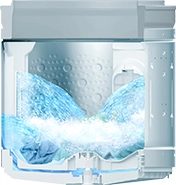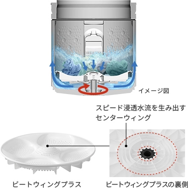 センターウィングで生み出した[スピード浸透水流]で、中央からも循環水を引き込み、衣類全体に高濃度の洗剤液の浸透を促進します。