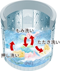 押し洗い・もみ洗い・たたき洗いの3つの洗い方と、大流量のシャワーで汚れを洗い出してすっきりきれい。