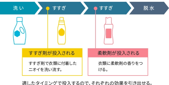 すすぎ剤で衣類に付着したニオイを落としたあとに、衣類の量に合わせた柔軟剤を投入して香りをつけるので、柔軟剤の香りをより楽しめます。